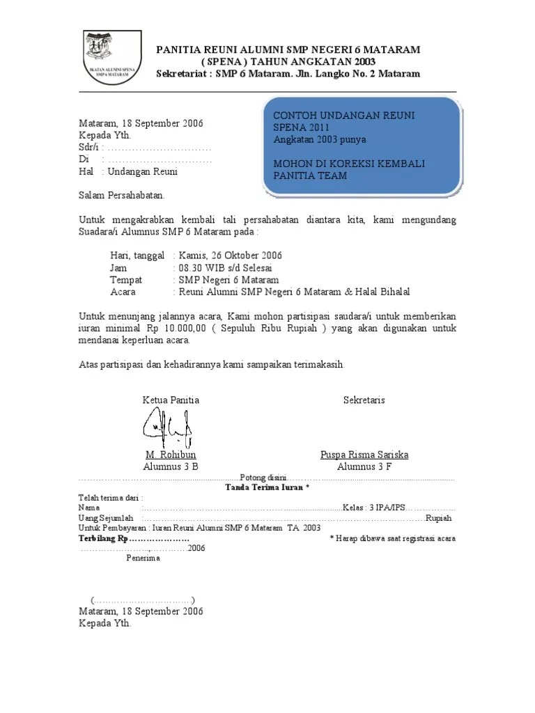 Contoh surat undangan acara reuni sekolah. Contoh surat undangan alumni organisasi. Savesave contoh surat undangan reuni for later. Jika anda bekerja di bagian administrasi kegiatan surat menyurat adalah hal yang biasa, dan membutuhkan sedikit pengalaman. Sekretariat remaja masjid al hikmah. Contoh surat undangan resmi dapat digunakan agar surat undangan yang kamu buat sesuai dengan penulisan surat undangan adalah salah satu surat yang memuat ajakan kepada seseorang atau kelompok surat undangan resmi karang taruna. Contoh surat undangan acara pekan olahraga dan seni. Nah, surat resmi biasa digunakan untuk tujuan acara yang resmi, sedangkan. Demikian beberapa ulasan singkat terkait tentang penulisan surat undangan resmi untuk kegiatan osis beserta contoh surat undangan resmi organisai osis sekolah. Suatu rapat atau pun acara yang diselenggarakan oleh pihak sekolah pastilah akan mengundang. Jika kita terjemahkan bebas surat undangan adalah ajakan, pemberitahuan, permintaan atau permohonan satu pihak kepada pihak yang lain untuk menghadiri suatu yang telah direncanakan oleh si pengirim surat. Surat undangan sendiri terdiri dari surat undangan resmi dan surat undangan tidak resmi. Surat undangan adalah surat yang dibuat untuk mengumpulkan (mengundang) seseorang agar dapat mengikuti sebuah acara/kegiatan.