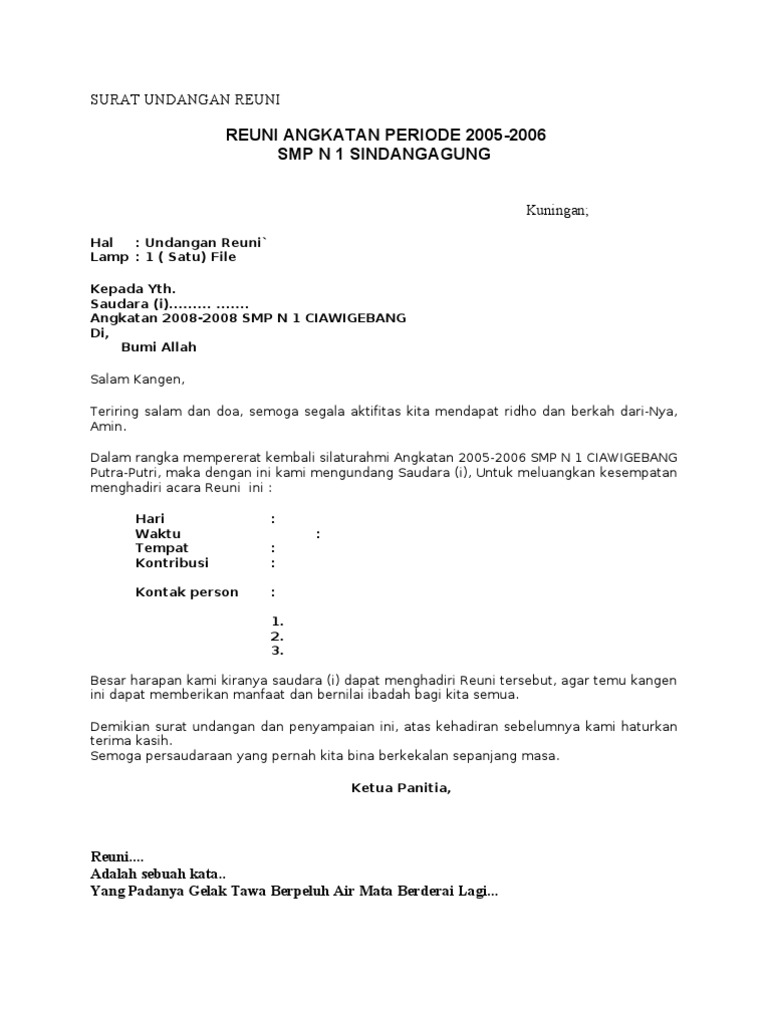 Contoh undangan reuni dibutuhkan sebagai bahan acuan untuk membuat surat ajakan yang sesuai dengan kebutuhan acara. Pada kesempatan ini akan kita bahas contoh draft surat ini. Pengurus ikatan alumni sman 10 angkatan 99 bengkulu jln. Dalam surat undangan reuni sebenarnya tidak diperlukan kalimat yang terlalu resmi atau format. Karena dirasa cukup pentingnya acara tersebut, maka kami mengharapkan kedatangan para perwakilan sekolah dan untuk dapat hadir tepat waktu.